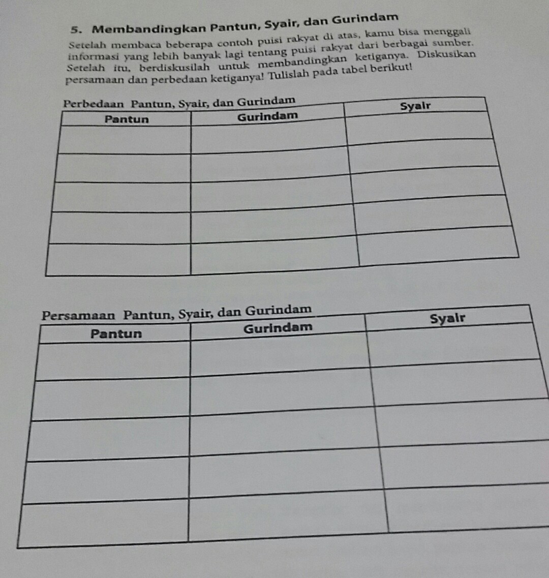 Makna/isi pada larik 1 dan 2 dengan larik 3 dan 4. Biasanya berupa sebuah lukisan alam atau hal apa saja yang diambil sebagai suatu kiasan. perbedaan dan persamaan pantun, puisi, syair, dan gurindam. perbedaan puisi lama dan puisi baru. Tetapi dari sekian banyak puisi yang ada, terdapat 5 jenis puisi rakyat yang paling terkenal dan masih digunakan hingga saat ini, yaitu :