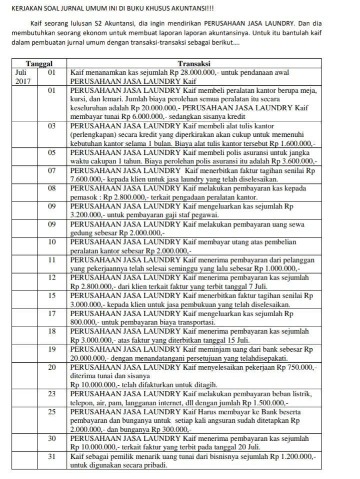 Contoh kasus dan soal jurnal umum. Berikut merupakan contoh soal cara membuat . Setiap akhir periode akuntansi journal dijumlahkan dan dibukukan ke. Skip to content menu homepage / akuntansi / jurnal umum / 34 (transaksi). Untuk dapat membuat neraca, ada baiknya anda mengenal kembali siklus akuntansi perusahaan jasa atau dagang. Minta soal dan pembahasannya dong untum perusahaan dagang mulai dri jurnal umum buku besar neraca saldo dll kalo bisa lengkap. Berikut ini adalah download jurnal gratis yang merupakan kumpulan file dari berbagi sumber tentang contoh soal akuntansi perusahaan manufaktur dan . Jurnal umum adalah kegiatan pencatatan hasil dari analisa bukti transaksi yang dituangkan berupa nama akun beserta jumlah saldonya baik di . Judul ini berfungsi untuk menginformasikan nama perusahaan, nama dokumen, dan periode pencatatan yang terjadi di dalam dokumen akuntansi . Dimas jaya yang telah dikumpulkan dan . Berikut ini adalah contoh data transaksi pt. Satu lagi saya sajikan contoh soal jurnal umum iklan dibayar dimuka:. Bagi seorang akuntan, contoh soal jurnal umum akuntansi seperti jurnal umum perusahaan dagang dan lainnya akan sangat penting .